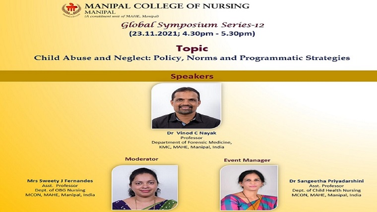 Global Symposium Series –12 on ‘Child Abuse and Neglect: Policy, Norms and Programmatic Strategies’ was organized by Team-Reach and Internationalization of Manipal College of Nursing, MAHE, Manipal on November 23, 2021, from 4.30 pm to 5.00 pm.