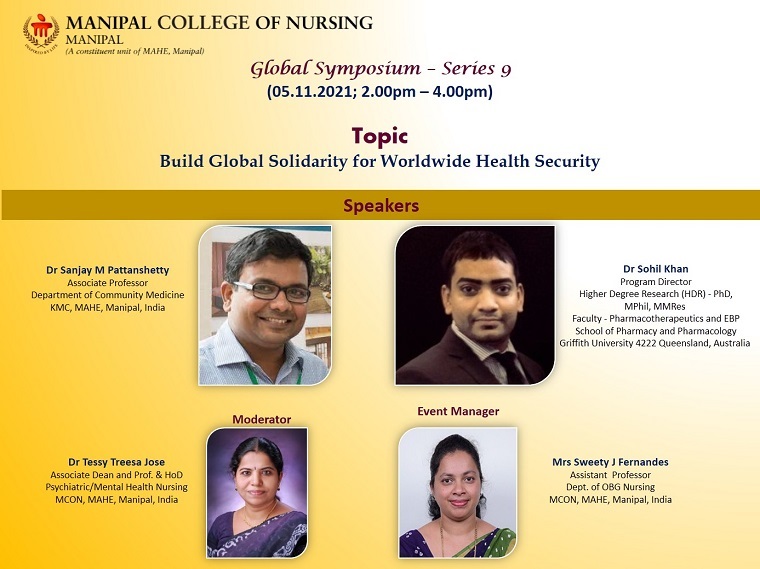 Global Symposium Series - 9 on ‘Build Global Solidarity for Worldwide Health Security’ was organized by Team- Expanding Reach and Internationalization, Manipal College of Nursing, MAHE, Manipal, on November 5, 2021, from 2 pm to 4 pm. Dr Sohil Khan, Higher Degree Research (HDR) Program Convenor - PhD, MPhil, MMRes, Faculty -Pharmacotherapeutics and Evidence-Based Practice School of Pharmacy and Medical Sciences, Griffith University, Australia and Dr Sanjay M Pattanshetty, Associate Professor, Department of community medicine, KMC Manipal, MAHE, were the speakers of this virtual symposium.