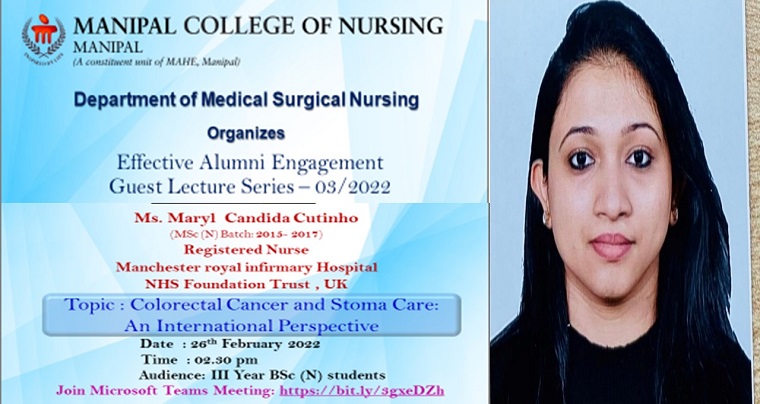 Department of Medical-Surgical Nursing, Manipal College of Nursing, Manipal organized an effective alumni engagement Guest Lecture series on “Colorectal Cancer and Stoma Care: An International Perspective” on 26th February 2022 between 02.30 pm & 03.00 pm to III year BSc Nursing and I year PBBSc Nursing students through Microsoft Teams Platform. Ms Maryl Candida Cutinho (MSc (N) Batch: 2015- 2017) Registered Nurse, Manchester Royal Infirmary Hospital, NHS Foundation Trust, UK spoke on the topic. She spoke on colorectal cancer, types, clinical manifestations, diagnostic procedures and its management including different surgeries performed. She also gave information about the role of stoma nurses in the UK and how stoma care was performed in their settings. A total of 102 participants, including students and faculty members of the college, participated in the session.