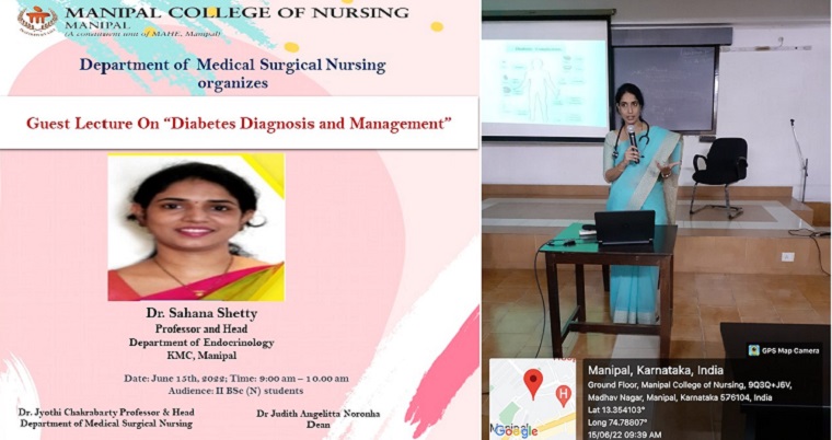Department of Medical-Surgical Nursing, Manipal College of Nursing, Manipal organized a Guest Lecture on “Diabetes diagnosis and management” on June 15, 2022, between 9.00 am and 10.00 pm for II year BSc Nursing students. Dr. Sahana Shetty, Professor and Head, Department of Endocrinology, KMC, Manipal addressed the topic. The session highlighted the causes, pathophysiology, diagnostic measures, and complications. She emphasized the management of diabetic patients with relevant clinical examples.