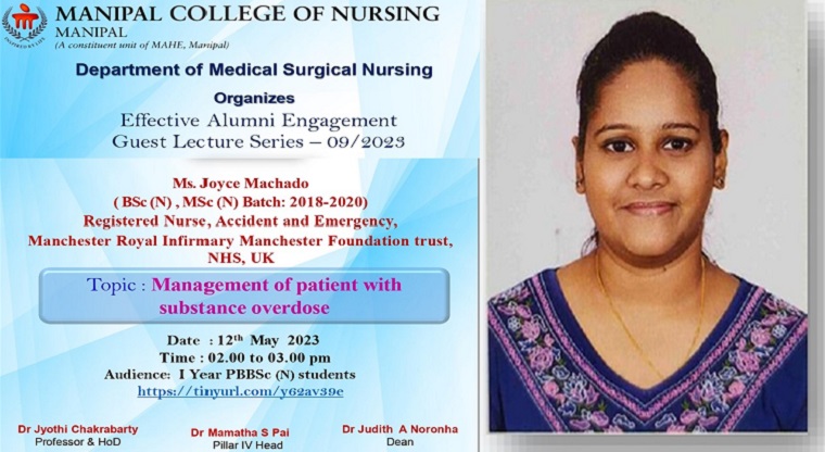 Department of Medical-Surgical Nursing, Manipal College of Nursing, Manipal organized an effective alumni engagement Guest Lecture on “Management of patient with substance overdose” on May 12, 2023, between 2.00 pm & 3.00 pm to I year PBBSc Nursing students through Microsoft Teams Platform. Ms. Joyce Machado (BSc (N) Batch: 2013- 2017), MSc (N) Batch: 2018- 2020), Registered Nurse,  Department of Accident and Emergency, Manchester Royal Infirmary, Manchester Foundation.