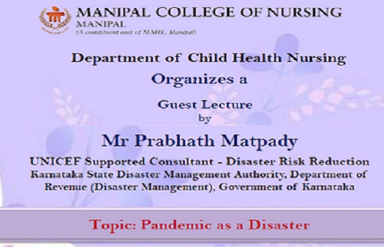 Department of Child Health Nursing, Manipal College of Nursing, Manipal Academy of Higher Education, Manipal organized a Guest Lecture on “Pandemic as a Disaster” on September 23, 2020, between 3.00 pm & 4.00 pm for undergraduate and postgraduate nursing students through Microsoft Team Platform. Mr Prabhath Matpady, UNICEF supported consultant - Disaster Risk Reduction at Karnataka State Disaster Management Authority, Department of Disaster Management, Government of Karnataka was the speaker for the session. He discussed the vulnerability status of individuals who can be infected with Covid-19 and emphasized various capacities such as physical preparedness, social and economic stability and human resource development to combat the pandemic. He also described the importance of 5’T’s to tackle coronavirus crisis which indicates testing, tracing, tracing and monitoring, teamwork and treatment.