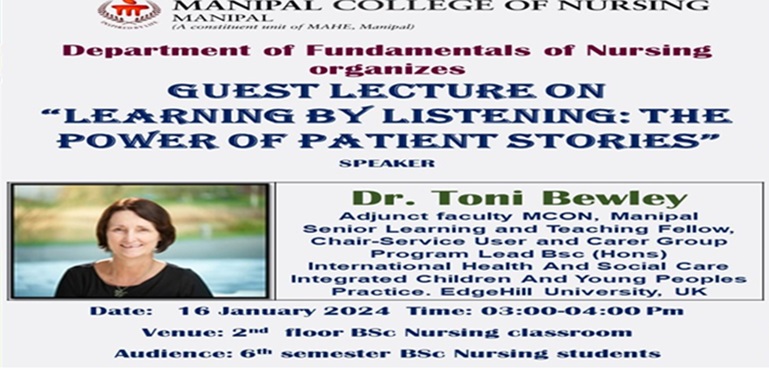 Dr Toni Bewley, a senior teaching fellow at Edgehill University, UK, and an adjunct faculty of Manipal College of Nursing shared her experiences on “The Power of Patient Stories” on January 16, 2024, at 3.00 PM for the 5th semester BSc Nursing at 2nd floor MCON classroom.