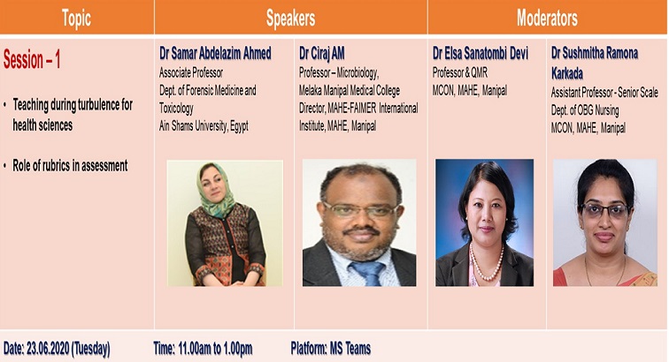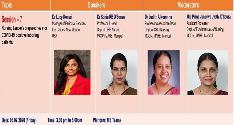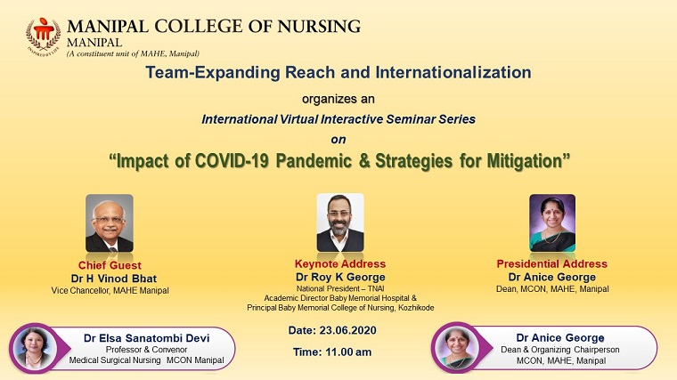 Nursing besides being noble, is an ever evolving profession, with empathy and inventiveness being the driving force behind quality patient care. Amidst the COVID-19 chaos, it was our profession that marched at the frontline. Digital campaigns and webinars prove to be a virtual boon and more so, it being organized by reputed institutions like Manipal College of Nursing, MAHE, Manipal. It was a matter of immense privilege and pride for me to be a part of this thought provoking webinar on the topic “Impact of Covid-19 Pandemic and Strategies for Mitigation”. I would like to congratulate Dr. Anice George, Dean and Organizing Chairperson and Dr. Elsa Sanatombi Devi, Professor and Convener, MCON, for organizing this wonderful webinar and seeing it through with perfection. It was an honor to have Dr. H Vinod Bhat, Vice Chancellor, MAHE Manipal as the chief guest for the inauguration of the virtual seminar series.