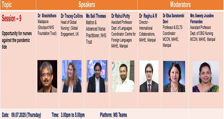 We welcomed on board Dr Raghu AR, Director-International collaborations at MAHE, Manipal who gave the presidential address and made an impact in the lives of the young graduates by pronouncing various facilities the University has created so that Nurses could get direct access to IELTS learning center free of cost and test Centre from this summer onwards. He also highlighted the glimpses of the processing in collaboration with NHS, UK. He further emphasized on expansion of opportunities for MAHE students and faculty exchange program that can bridge the gaps that exist. Dr Raghu believes in positive networking for collaboration and research projects. He firmly made a note that these series of seminars and the speakers’ caliber can enhance research collaborations across the globe. This virtual 10 series are methodically organized and he appreciated the TEAM: Expansion Reach and internationalization for venturing into this difficult trying times leaving no stone unturned.
