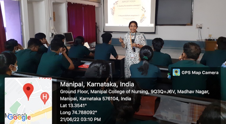 The Department of Medical Surgical Nursing, Manipal College of Nursing, MAHE, Manipal conducted a Guest Lecture on 21st June, 2022 as part of International Day of Yoga 2022 for the II Semester BSc Nursing students. The topic for the Guest Lecture was “Yoga for Humanity” which is the theme of this year’s Yoga Day. Dr Lavya Shetty, Lecturer, Division of Yoga, Centre for Integrative Medicine and Research (CIMR), MAHE, Manipal was the Resource Person. A total of 102 participants including students and faculty attended the session. Dr Lavya Shetty spoke on meaning of yoga, its origin, aims, concepts of ahara according to yoga and types of yoga. She also emphasized on the benefits of practice of yoga, practice of pranayama, practice of mudra, practice of asanas and benefits of dhyana along with a demonstration of pranayama.