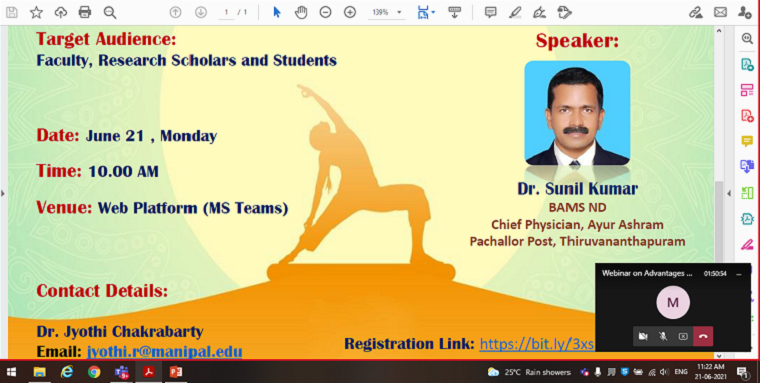 Yoga helps to integrate the mind, body and soul. International Yoga Day is an annual event commemorated every year on 21 June from 2014, when a resolution to adopt June 21 as the International Yoga Day proposed by India was supported by 177 nations at the UN. Department of Medical-Surgical Nursing, Manipal College of Nursing, MAHE, Manipal conducted a webinar as part of International Yoga Day 2021. The topic for the webinar was “Advantages of Yoga and Ayurveda in Modern Life”. Dr Sunil Kumar (BAMS, ND), chief physician at AyurAshram, Pachalloor post, Thiruvananthapuram delivered the webinar. A total of 67 participants with different professional backgrounds have attended the session. Dr Sunil Kumar spoke about yoga, different postures for yoga and their benefits, certain practice tips while performing yoga, relaxation, and meditation. He also emphasised the special precautions to be taken by people diagnosed with abdominal hernia, arthritis, back or neck pain, chronic bronchitis and emphysema, depression, epilepsy, high blood pressure, heart disease and obesity while practising yoga. He talked extensively on Ayurveda with special emphasis on Panchakarma therapy and its benefits. He elaborated on Abhyanga, Pizhichil, Gandoosha, Sirodhara, Snehaavagaha, Tharpana and different other Ayurvedic treatment procedures. He also highlighted the importance of herbal remedies in maintaining wellness. This webinar was conducted as instructed by University Grant Commission (UGC) vide its Circular dated 14th June 2021 and was coordinated by Dr Jyothi Chakrabarty Professor & Head, Dept. of Medical-Surgical Nursing, Manipal College of Nursing, MAHE, Manipal.