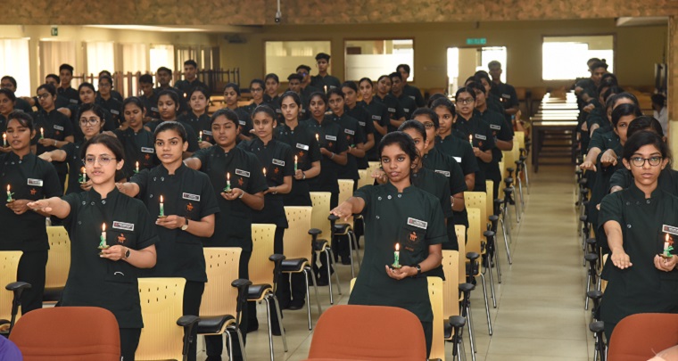 The Lamp lighting ceremony is held as a tribute to Florence Nightingale an auspicious occasion in every nurse’s life. The budding nurses, adorned in their uniforms for the first time, formally mark their entry into the nursing profession. It is an important event, where the lamp symbolises the light that a nurse becomes to her patients and as a symbol of hope and comfort to those who are suffering. Students light this lamp as a commitment, and they recite the Nursing pledge of the service. A total of 97 students of first-year BSc Nursing received the light from the Chief Guest, Dr Suja Karkada, Principal, CSI Lombard Memorial College of Nursing, Udupi, Dr P Suba Sooria, Head of Nursing Services, Kasturba Hospital Manipal, Dr Judith A. Noronha, Dean, Manipal College of Nursing, Manipal and Dr Tessy Treesa Jose, Associate Dean, Manipal College of Nursing, Manipal which was followed by the oath-taking ceremony of the novice nurses.