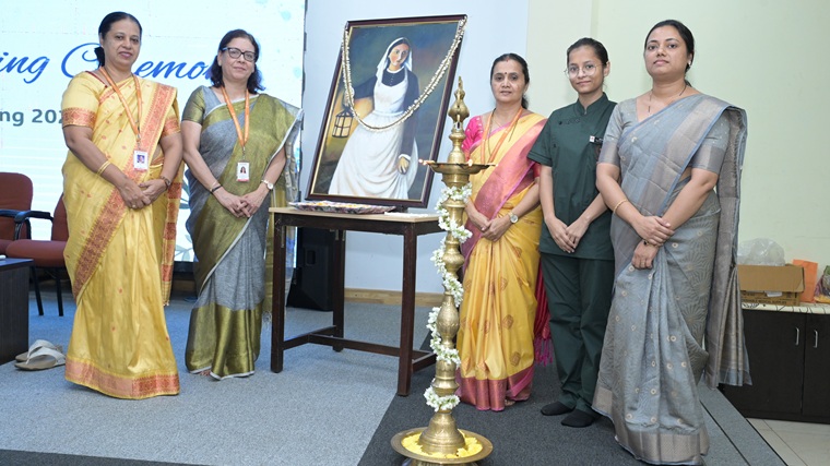 Following the invocation, Dr. Savitha Prabhu extended a warm welcome to all dignitaries and guests, faculty and students, setting the tone for an inspiring event. The dignitaries, along with Ms. Khushi, Class President, then lit the ceremonial lamp, symbolizing the light of knowledge, compassion, and service. A floral tribute to Florence Nightingale, the founder of modern nursing, was offered as a mark of respect and gratitude.