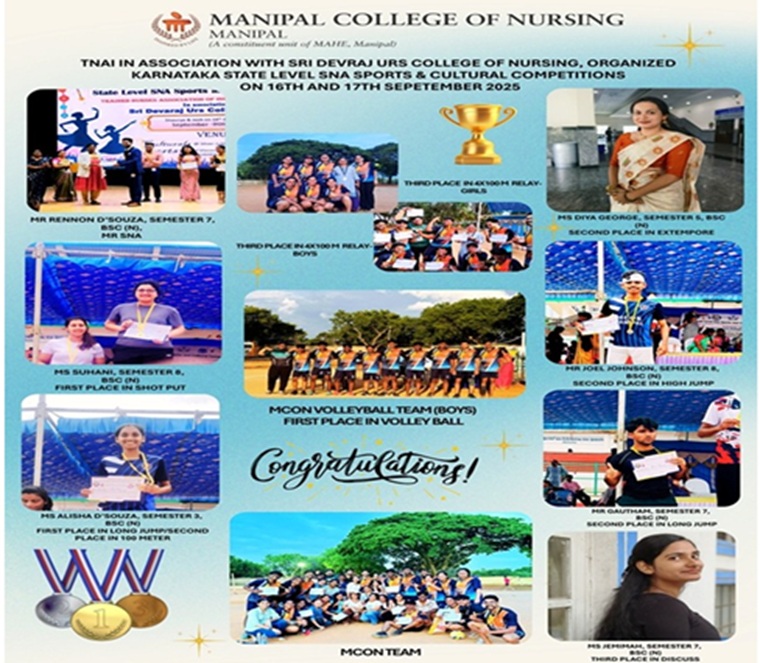 Manipal, September 17, 2025 – Students of Manipal College of Nursing (MCON), Manipal brought laurels to the institution by securing multiple prizes at the Karnataka State Level Student Nurses’ Association (SNA) Sports and Cultural Competitions, organized by TNAI in association with Sri Devraj Urs College of Nursing on 16th and 17th September 2025.