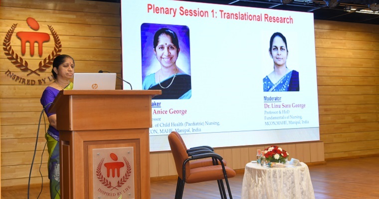 Day 1 of the conclave started with the plenary session on “Translational Research” by Dr Anice George, Professor, Department of Child Health (Paediatric) Nursing, MCON, MAHE, Manipal on 19th January 2022, at 1.00 pm. In her talk, Dr Anice said translational research goes beyond the “bench to bedside” paradigm, enumerating the various aspects of the method of research. She highlighted the roadmap of translation research, phases of clinical research, translational spectrum, and the various models, barriers and enablers of translational research. She encouraged nursing learners and experts in clinical and education areas to collaborate and work towards bringing out the basic research from the vacuum to the family and community requiring health care services. The session was moderated by Dr Linu Sara George, Professor and Head, Department, Fundamentals of Nursing, MCON, MAHE, Manipal.
