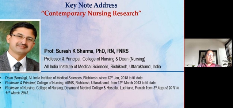Dr Suresh K Sharma, Principal, AIIMS, Rishikesh addressed on the theme “Contemporary Nursing Research”. In his speech, he explained the need for rigorously conducted and properly disseminated nursing research in India by the nursing fraternity. He also emphasized that nursing research should be focused on caring related aspects and understanding the caring phenomenon. He necessitated the need for modifying and customizing the tools adopted from other specialities for nursing research. He called upon the nursing fraternity to conduct research which is of importance to the nursing profession.
