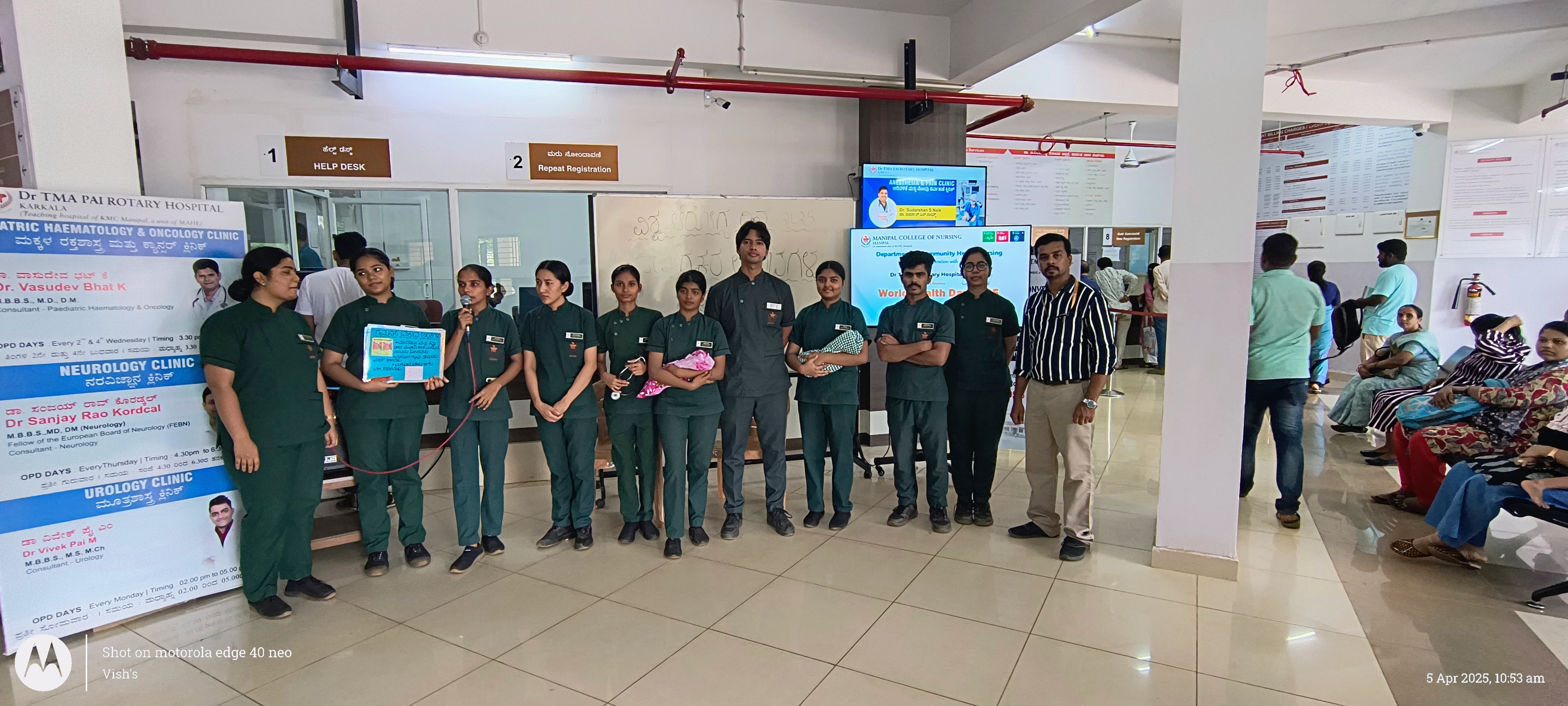 On April 5, 2025, an awareness program on the theme "Healthy Beginnings, Hopeful Futures" for antenatal and postnatal mothers and children was conducted at Dr T M A Pai Rotary Hospital, Karkala, from 10.30 am to 12.30 pm. Final year BSc Nursing students performed a skit on “Importance of antenatal check-up,” which highlighted the importance of regular antenatal visits, nutrition, immunization, etc., and also the importance of immunization for children. Students demonstrated the techniques of hand hygiene and the importance of personal hygiene. This event was coordinated by Dr Vinish V, Assistant Professor-Senior scale, Department of Community Health Nursing, MCON, MAHE, Manipal.