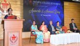 The chief guest of the day, Dr. Deepika Cecil Khakha, Nursing Advisor, Directorate General of Health Services (DGHS), Ministry of Health and Family Welfare, Government of India, emphasized that any educational institution thrives on four pillars: diligence, perseverance, passion, and resourcefulness, which help to achieve impressive milestones and earn reputable standing. She highlighted the importance of core essentials of the nursing profession like compassion, professionalism, and teamwork, emphasizing resilience, adaptability, and leadership. She called on the graduates to celebrate each other’s achievements and maintain an attitude of gratitude. In her address, she told students to be ambassadors of quality and urged them to prioritize their physical and mental well-being alongside their academics, so they can contribute effectively to nation-building.