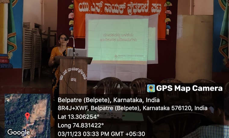 Department of Psychiatric (Mental Health) Nursing, MCON, MAHE organised an awareness program on ‘Harmful effects of substance use’ on 03.11.2023 from3.30 PM to 4.30 PM at U S Nayak High School, Patla, Udupi, for the students and teachers as part of the 125th birth anniversary of Dr. T.M.A. Pai.