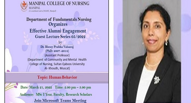 A session on “Human Behaviour” was organized by the Dept. of Fundamentals of Nursing, Manipal College of Nursing, MAHE Manipal on March 21, 2022, at 2 pm for MSc students, faculty members, and research scholars of Manipal College of Nursing through Virtual Google Meet Platform.