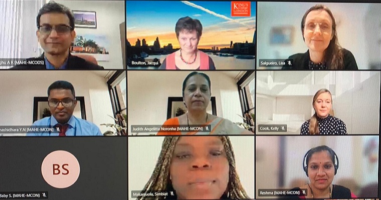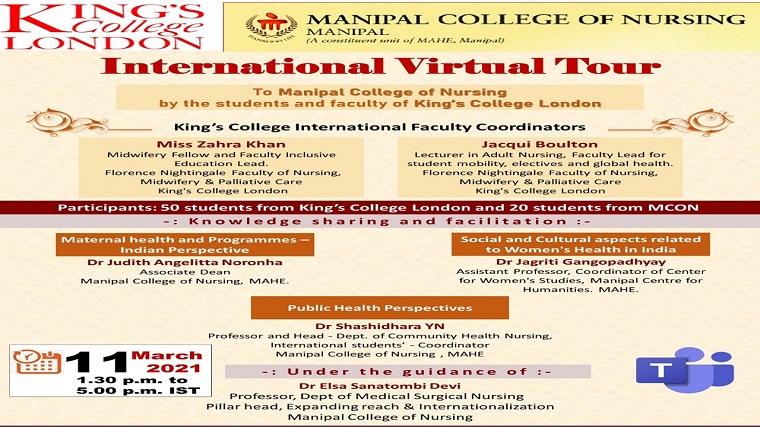 An international virtual visit to Manipal College of Nursing by the students of Florence Nightingale Faculty of Nursing, Midwifery & Palliative Care King’s College London was organized on 11th March 2021. The purpose of the visit was to provide an opportunity to interact with International students and mutually share the experience of health care service delivery, women’s health and social and cultural aspects related to women's health. The programme commenced with the welcome address by Dr Elsa Sanatombi Devi followed by an introduction on a virtual tour by Miss Zahra Khan and Miss Jacqui Boulton, faculty of King’s College London. Dr Raghu A Radhakrishnan, Director – International affairs and collaborations, MAHE addressed the gathering. In his speech, he appreciated MCON for organizing such events in this pandemic situation. Dr Anice George, Dean, MCON briefed about the courses available at MCON Manipal.