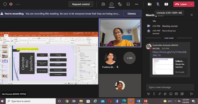 As a part of International Women’s Day 2022 a webinar on “Break The Bias” was organized by the Department of Obstetrics and Gynecological Nursing, Manipal College of Nursing, MAHE, Manipal on 8th March 2022 virtually on Microsoft Teams Platform. Ms Ida D’Souza, Assistant Professor, Department of Global Health, PSPH, MAHE, Manipal, who was the resource person for this webinar focused on the need to celebrate International Women’s Day, and also on how women can be self-empowered. She emphasized the need for women to know about the various legislations that favour women and highlighted the need to achieve gender sensitivity and 0% domestic as well as 0% sexual violence.