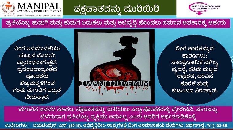 A radio program on "gender bias" was broadcasted on 8 March 2022 at 5.00 pm and rebroadcasted on 9 March 2022 at 12 noon through 90.4 FM Radio Manipal. The program was conducted by faculty members and PhD scholars of the OBG Nursing Department and coordinated by Mrs Shoba, Lecturer, MCON, MAHE, Manipal. The program presented a short skit and gave a social message that stressed on gender bias as well as the importance of education to the girl child.