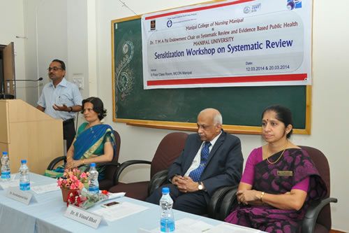 Manipal College of Nursing, Manipal and Dr.T.M.A.Pai Endowment chair on Systematic review and Evidence Based Public Health, Manipal Academy of Higher Education organized a one-day sensitization workshop on Systematic Review on March 12 and 20, 2014 respectively. Faculty from Manipal College of Nursing Manipal, Manipal School of Nursing and Manipal College of Nursing Mangalore attended the workshop. The objective of the workshop was to create awareness about systematic review. The workshop was attended by 76 participants in 2 batches.