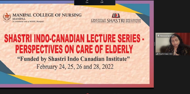 Manipal School of Nursing, MCON, MAHE, Manipal had organized, Shastri Indo Canadian lecture series, on the topic-perspectives on the care of elderly funded by Shastri Indo Canadian Institute. The inaugural ceremony was organized on 24th February 2022 at 9 am, followed by the first-day session. The lecture series further continued for three days on the 25th, 26th and 28th of February 2022.