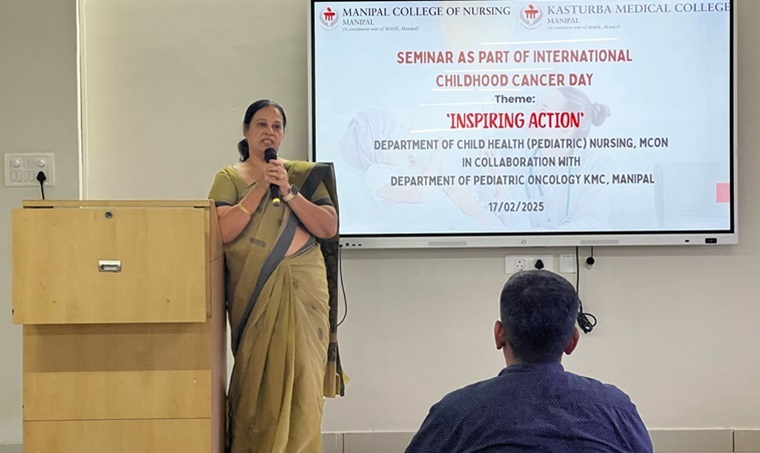 The Department of Child Health (Pediatric) Nursing, Manipal College of Nursing (MCON), MAHE, in collaboration with the Pediatric Oncology Department, Kasturba Medical College Manipal, organized a seminar on the occasion of International Childhood Cancer Day on February 17, 2025. The theme for this year’s event, “Inspiring Actions,” aimed at fostering awareness, enhancing knowledge, and encouraging proactive measures in pediatric cancer care.