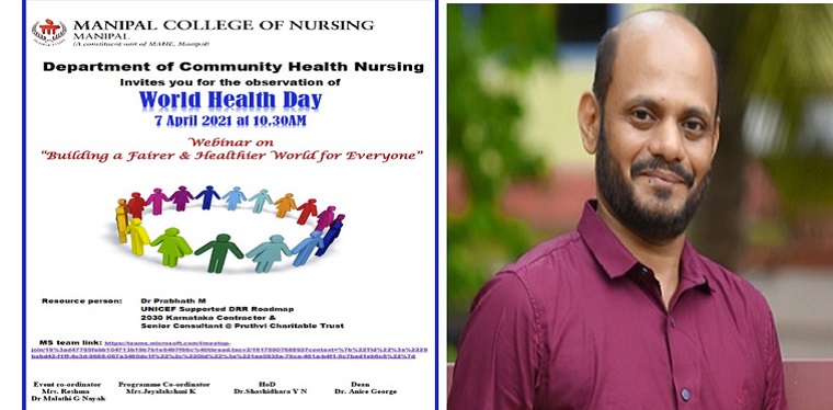 The webinar on “building a fairer and healthier world for everyone” was organized on April 07, 2021 at 10.30 am through the Microsoft Team platform to the students and faculty of MCON, MSON and other health science fraternity. The resource person was Dr Prabhath M @ UNICEF Supported DRR Roadmap 2030 Karnataka contractor & Senior Consultant @ Pruthvi charitable trust.