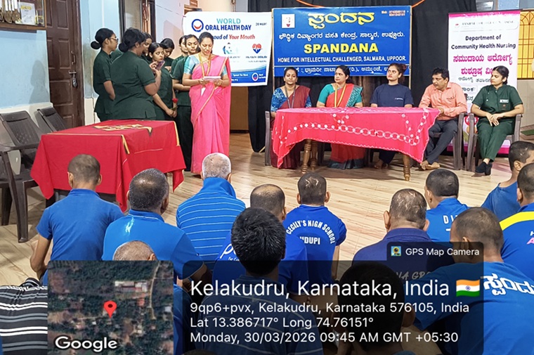 The health camp was organized on March 30, 2026, from 9:00 AM to 12:30 PM, for mentally challenged inmates at Spandana Special School, Uppoor. A total of 50 individuals received screenings for general health (blood pressure, blood sugar, BMI) and dental health, including oral prophylaxis by the Department of Public Dentistry, and thirty-two clients were referred to the dental OPD at MCODS, MAHE. Faculty and postgraduate students of clinical psychology conducted psychological evaluations and identified clients who would benefit from speech therapy and behavioral interventions. This camp was coordinated by Dr. Ansuya, Associate Professor, Department of Community Health Nursing, MCON. Faculty members of the department, including Dr Vinish V, Mr Amol Powar, Ms Clara Dsouza, and Ms Surekha, actively participated in various tasks during the camp.