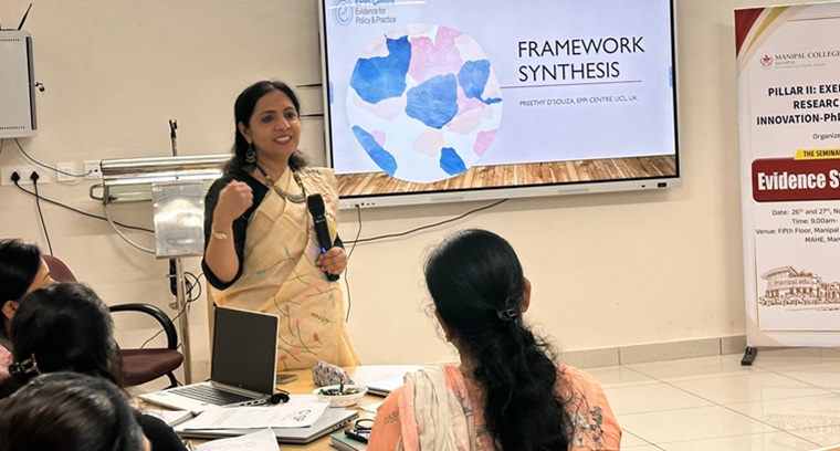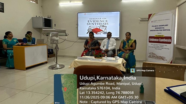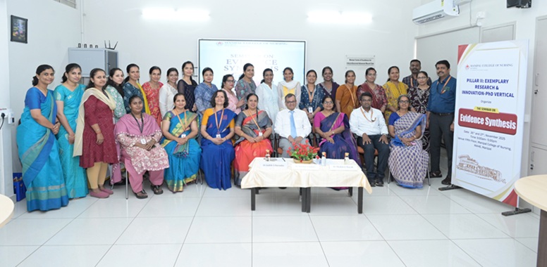 The PhD Vertical of Pillar II: Exemplary Research and Innovation, Manipal College of Nursing (MCON), Manipal Academy of Higher Education (MAHE), organized a two-day seminar on Evidence Synthesis on 26th and 27th November 2025 from 9:00 am to 5:00 pm. Dr Judith A. Noronha, Dean, MCON, welcomed the gathering and provided an overview of the program. The Chief Guest, Dr Naveen S. Salins, Director-Research, Directorate of Research, MAHE, emphasized the importance of incorporating evidence into practice for the benefit of stakeholders.