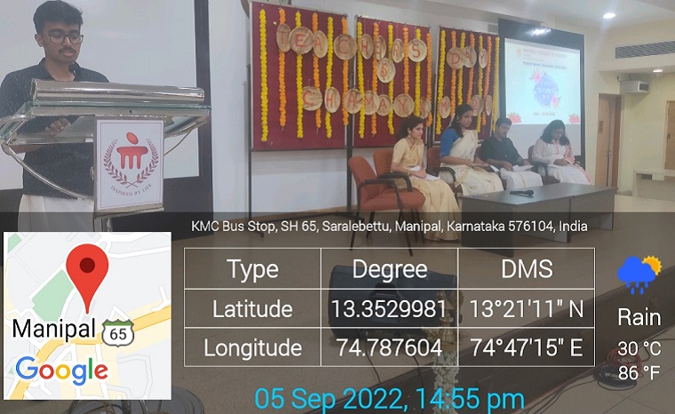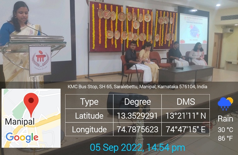 The Student Nurses’ Association of Manipal College of Nursing Manipal, celebrated teacher’s day on 5th September 2022 to acknowledge the contributions of teachers towards preparing the nurses of tomorrow. As a part of the celebration, students felicitated all the teachers, entertained with the cultural program and conducted games for the teachers. Dr. Judith A Noronha, Dean, Manipal College of Nursing, addressed the students and the teachers. She emphasized that there is no substitute for quality education because it alters the lives of thousands of Individuals and their families forever.