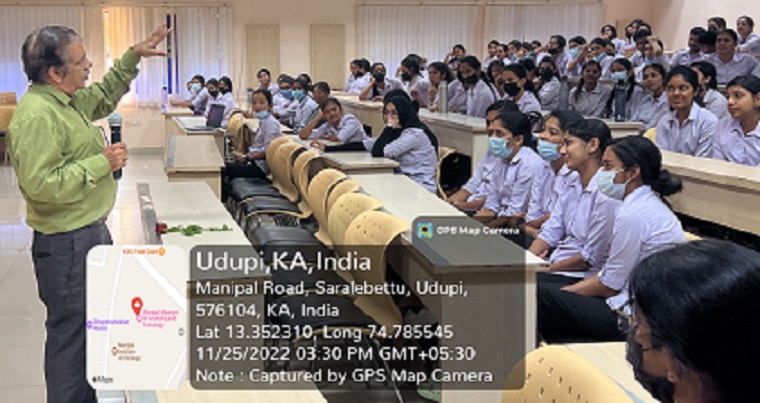 A guest lecture also was organized for the students of Manipal College of Nursing on the topic of “WE HAVE ONLY ONE EARTH” on 25-11-2022. The resource person for the program was Dr. Krishna Kothai, Emeritus Professor, Poornaprajna Centre for Research and Development, Udupi.