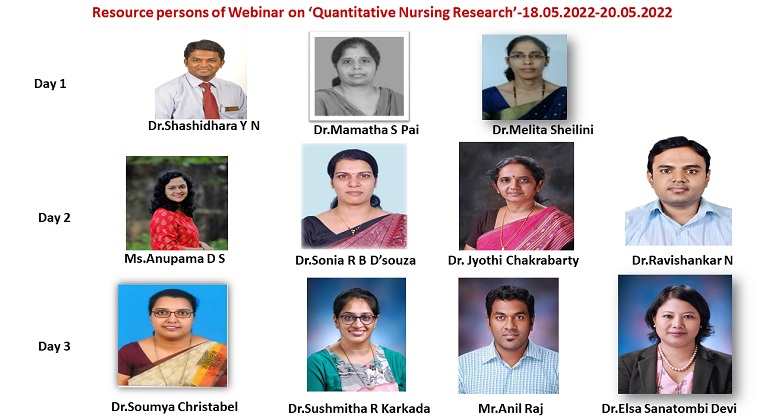 The three days webinar on quantitative nursing research commenced on 18.05.2022 through Microsoft Teams online Platform. This was organized by the first-year students of the Nurse Practitioner in Critical Care (NPCC) Postgraduate Residency Program, Medical-Surgical Nursing department, in collaboration with Pillar 2 (IoE): Exemplary Research and Innovation of Manipal College of Nursing (MCON), MAHE, Manipal.