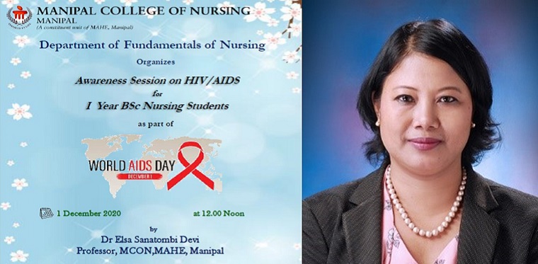 Dr. Elsa Sanatombi Devi, Professor, Department of Medical-Surgical Nursing took an awareness session on HIV/AIDS for first-year BSc Nursing students on December 1, 2020. She highlighted current statistics, meaning, stages of untreated HIV infection, transmission, and myths towards HIV transmission. She has also focused on other sexually transmitted diseases, diagnostic tests, management, and prevention of HIV infection.