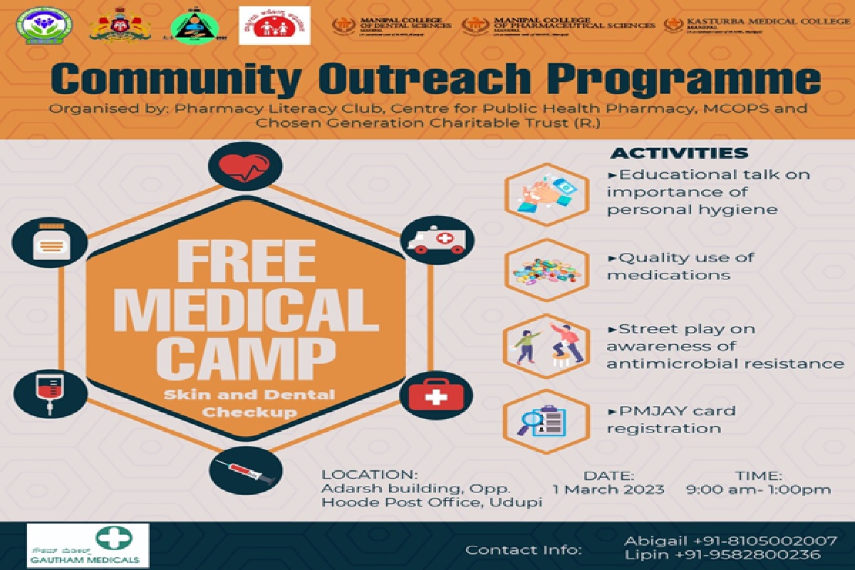 Pharmacy Literacy Club (PLC), Centre for Public Health Pharmacy, MCOPS, in association with KMC hospital, Manipal, MCODS, Manipal and Chosen Generation Charitable Trust (R.), conducted a community outreach program on 1 March 2023 at Adarsh building, Hoode, Udupi. The program involved a free general health check-up and dental care along with health education regarding the importance of personal hygiene and the quality use of antibiotics. The function was presided over by the president of Jamate Islami Hind, Hoode, Mr Abdul Khadeer Mohidin, Panchayat member and Vice President of Sahiyath Educational Institute, Mr Mohammed Idris, and the Panchayat members, Mrs Kusuma and Mrs Jamiela Sadida. The student volunteers performed a street play on "Awareness of Antimicrobial Resistance." They even helped the residents with Pradhan Mantri Jan Arogya Yojana (PMJAY) card registration. The program was inaugurated with a short introduction by Mrs. Abigail, followed by a prayer by Ms Shreya Shenoy (V PharmD) and a beautiful rendition of "Jogada Siri Belakhinalli" by Ms Anagha Ramamurthy (PharmD-Intern). A pre-test and post-test based on questionnaires were held before and after the skit to assess the impact of the act on the audience. Around 90 members of the community turned up and the students helped them with essential health education, dental care, and dermatology check-ups. The patients were provided with free medications, which were sponsored by Gautham Medicals, a unit of Gautham Agencies and Pharmaceutical Distributors, Udupi. The patients were provided medication counselling by pharmacy students of the Department of Pharmacy Practice, MCOPS. The event was successful, and the dignitaries and residents applauded the efforts and contribution of the club to educate the community members.