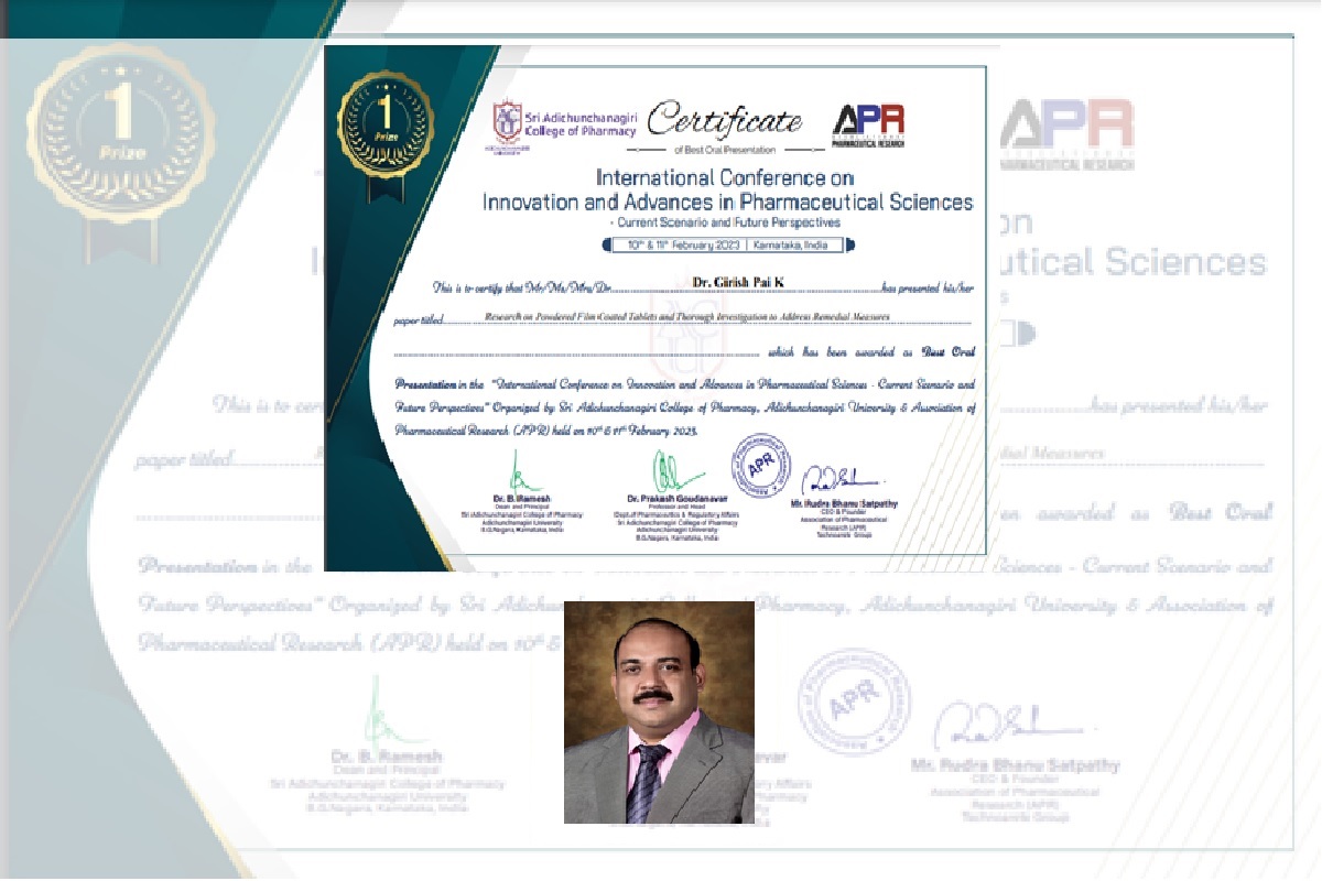 Dr. Girish Pai K, Associate Professor, Department of Pharmaceutics & Coordinator - Centre for cGMP, MCOPS, MAHE presented the research work entitled “RESEARCH ON POWDERED FILM COATED TABLETS AND THOROUGH INVESTIGATION TO ADDRESS REMEDIAL MEASURES” and received First Prize in Oral Presentation at “International Conference on Innovation and Advances in Pharmaceutical Sciences – Current scenario & Future perspectives (ICIAPS - 2023)”. The research work was awarded First Prize under the category, “Pharmacovigilance and Risk Management”. This conference organized by Adichunchanagiri College of Pharmacy, Adichunchanagiri University, and Association of Pharmaceutical Research (APR), B G Nagara, Karnataka was held on 10 and 11 February 2023.