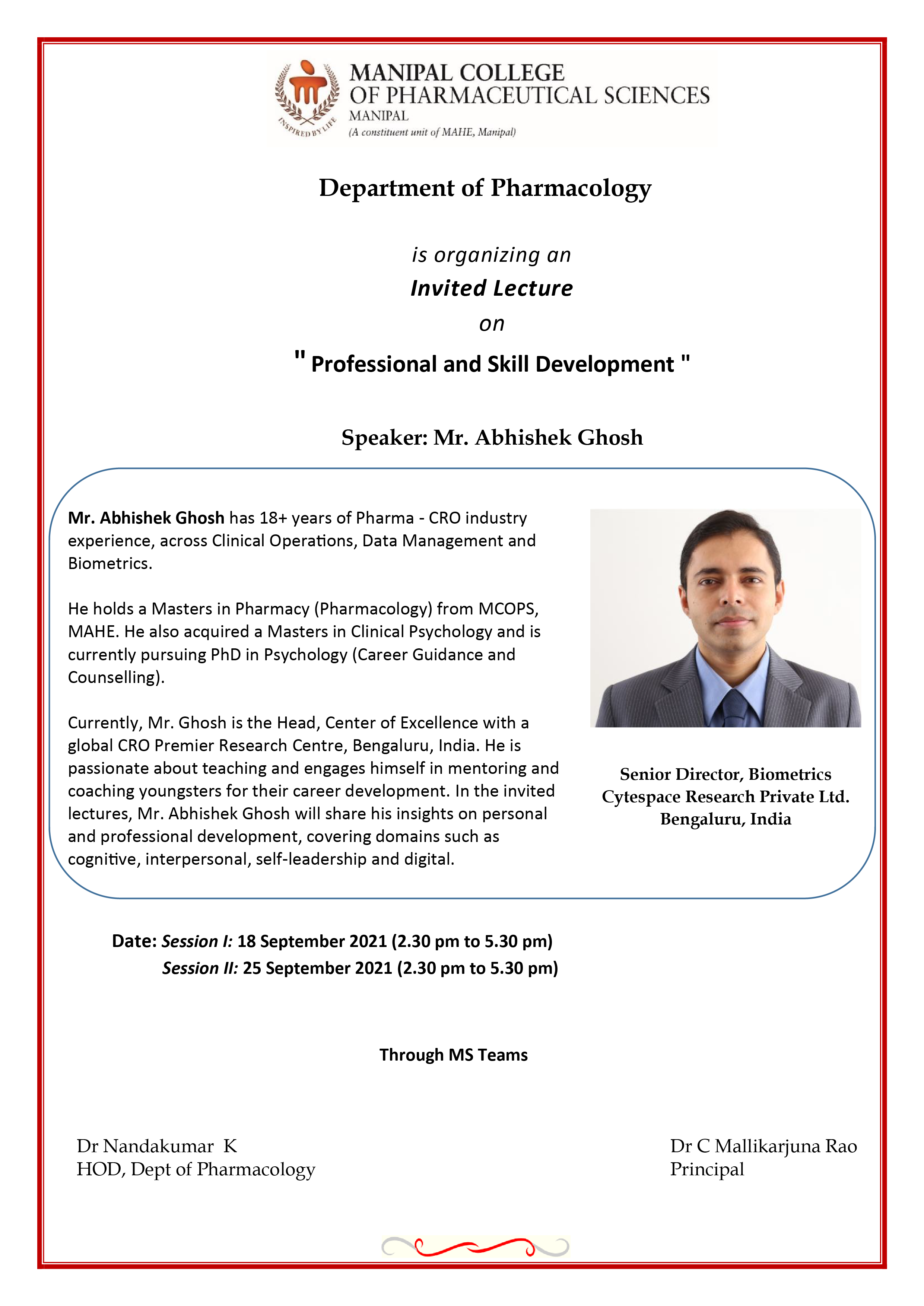 Department of Pharmacology is organizing an invited lecture" on "Professional and Skill Development " in two sessions via MST