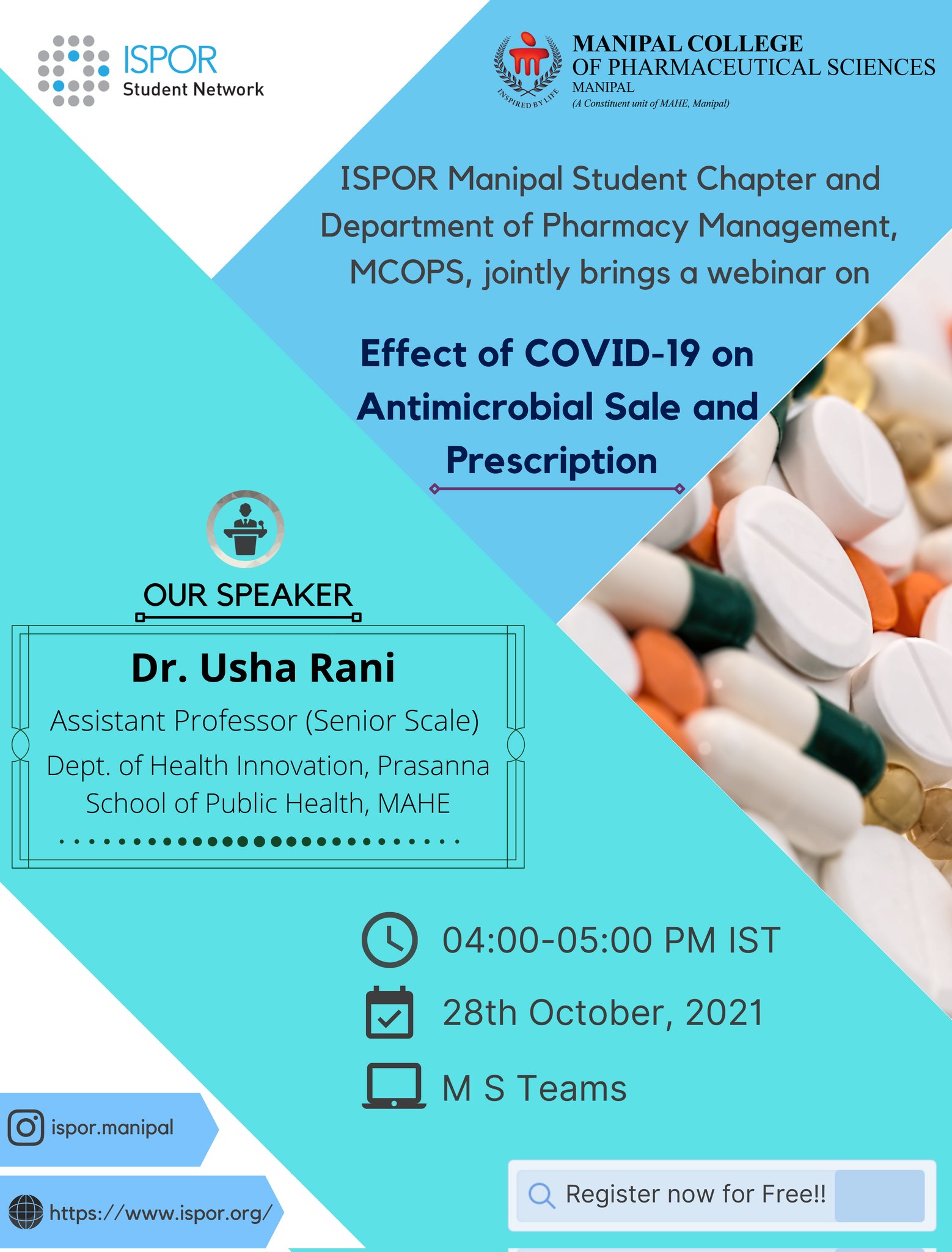 ISPOR Manipal student chapter and Department of Pharmacy Management is jointly hosting a webinar on the theme "Effects of Covid-19 on Antimicrobial sale and prescription" via MST