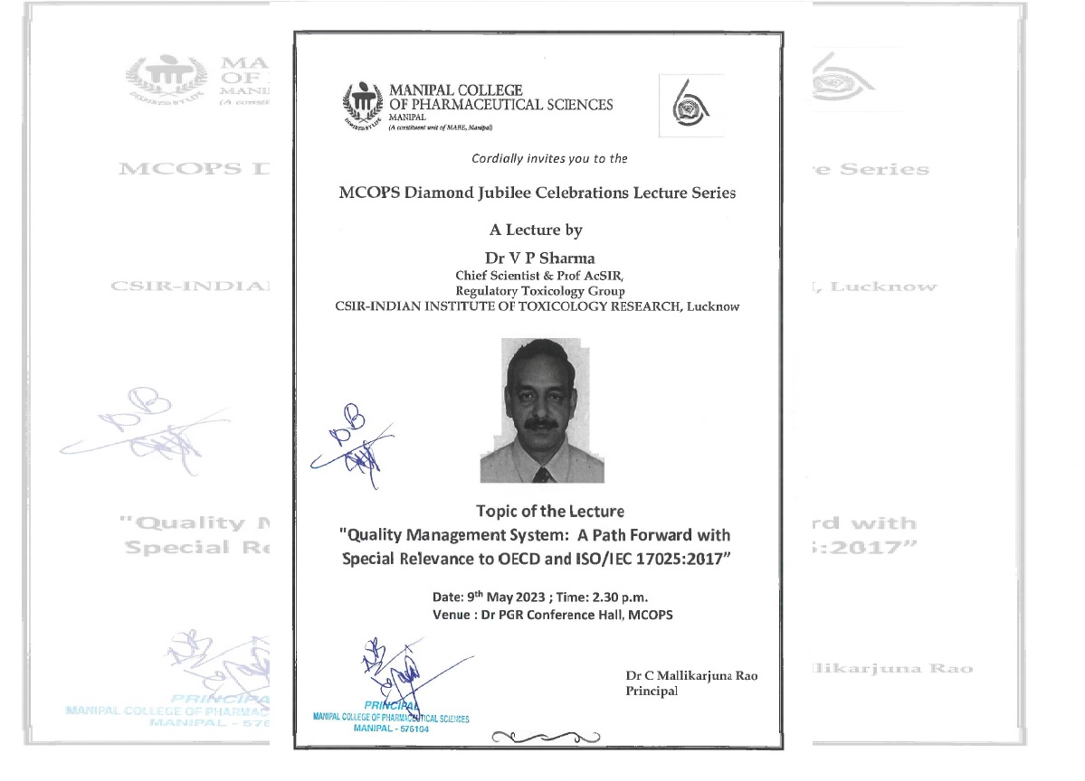 MCOPS Diamond Jubilee Commemorative Lecture Series on " Quality Management System: A Path Forward with Special Relevance to OECD and ISO/IEC 17025:2017" by Dr. V P Sharma, CSIR- Indian Institue of Toxicology Research, Lucknow