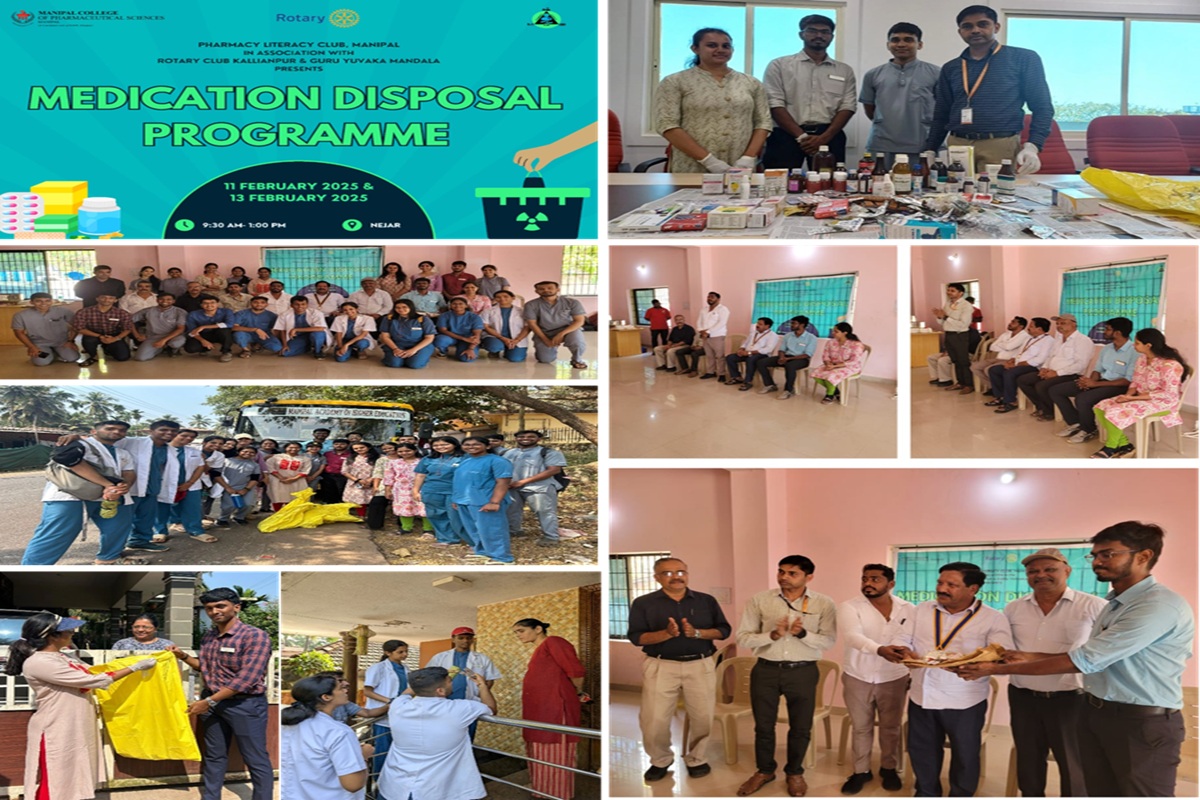 The Pharmacy Literacy Club (PLC), Centre for Public Health Pharmacy, Dept. of Pharmacy Practice-MCOPS, Manipal in collaboration with the Rotary Club and Panchayat, Kallianpura, successfully conducted the Medication Disposal Program on 11 February 2025.With the support of esteemed dignitaries from the Rotary Club and Panchayat, including Mr. Baptist Dias, President of Rotary Club Kallianpura, Mr. Satish Nayak, outgoing President of Panchayat Kallianpura, Mr. Brian D’Souza, Secretary of Panchayat Kallianpura and Mr. Alan Lewis, outgoing Assistant Governor and 22 dedicated volunteers. Expired medications from over 200 homes were collected while educating the community on the importance of safe medication disposal. The collected medicines were handed over to common treatment facility in the district for proper disposal, ensuring a safer environment. The event was successful with the active participation of volunteers and partners.