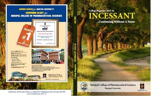 The college magazine of MCOPS “INCESSANT” (continuing without a pause) was released at a simple function held in MCOPS on 27 May 2016. The Chief Guest of the function Lt. Col. PS Shetti, Vice President (Projects and Services), MEMG Int. India Pvt. Ltd. officially released the magazine in the presence of a large audience, comprising faculty members, research scholars and students of MCOPS. Dr. C. Mallikarjuna Rao (Principal, MCOPS) in his welcome address conveyed best wishes to the outgoing students and asked them to take the good memories of their tenure at Manipal. He further appreciated the Students’ Affairs Council (Manipal Academy of Higher Education Association of Pharmacy Students, MAPS) and their editorial team for their hard work in bringing out the magazine on time. Dr. Jayesh Mudgal (Asst. Professor, Department of Pharmacology and Staff advisor – Editorial Committee, MAPS) reminisced on his association with the magazine and thanked the council members for their hard work. The chief editor, Khushboo Mistry (III BPharm) briefly touched upon her experience with the editorial work and acknowledged the help received from her teachers and peers. The final year BPharm student, Reshma Chatterjee (President, MAPS) compered the function and Dr C. S. Sreedhara (Professor of Pharmacognosy and Secretary, MAPS) expressed satisfaction on the consistent improvement in the quality of the magazine with time. He also proposed the vote of thanks.