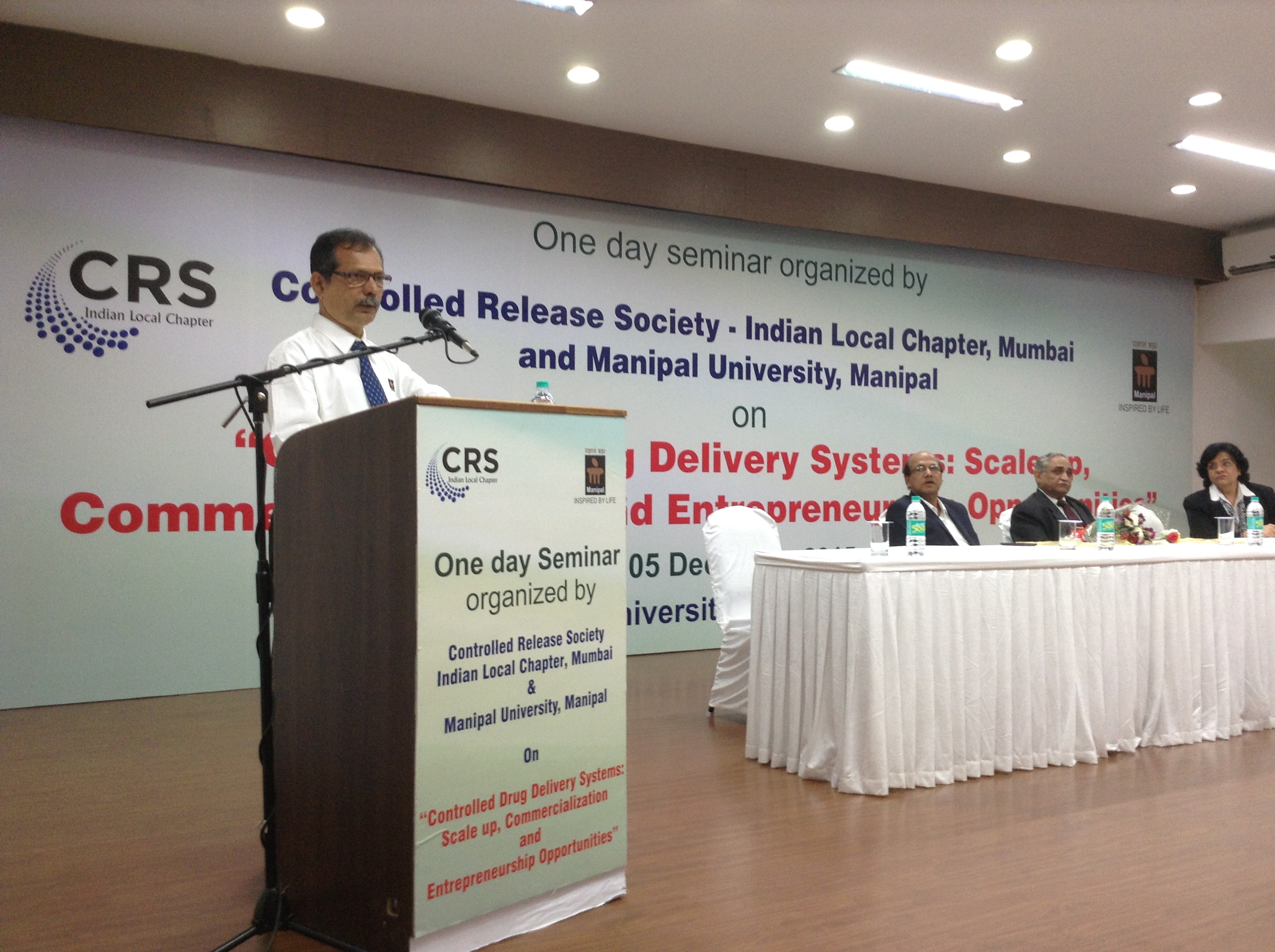 One-day seminar on “Controlled Release Drug Delivery Systems: Scale up, commercialization and Entrepreneurship Opportunities” was organized by CRS-Indian Local Chapter, Mumbai and Manipal Academy of Higher Education [MU] at Bengaluru Campus, Manipal Academy of Banking, Bengaluru on 5 December 2015. The seminar was partially sponsored by Ce-chem Laboratories, Bengaluru. The program was inaugurated by lighting the lamp in presence of the chief guest Shri M Chandrashekar, Director, Ce-Chem Pharmaceuticals Pvt. Ltd., Bengaluru. Dr Ramesh Bhonde, Director, School of Regenerative Medicine, Manipal Academy of Higher Education and Dr Parizad Elchidana, Managing Director, Apotex Research Pvt. Ltd., Bengaluru were Guests of Honour. Scientific sessions included guest lectures by eminent speakers such as Dr Shobha Rani Hiremath (Professor and Principal, Al-Ameen College of Pharmacy, Dr Vandana Patravale (Professor, Institute of Chemical Technology, Mumbai), Dr Parizad Elchidana , Dr N Udupa (Research Director, MU), Dr Vijay Kulkarni (Group Leader, Pharmaceutical Development Center, STEERLife India Pvt. Ltd., Dr Srinivas Mutalik (Professor, MCOPS) and Dr Karthik A (Senior Scientist, Advinus Therapeutics Ltd., Bengaluru). Talks were on the areas related to scaling up of controlled delivery systems, drug eluting stents, leveraging drug delivery strategies to drive innovation, different controlled release dosage forms, hot melt extrusion technology, etc. Dr Vinay Rao (Director, Pharmaceutical Development Center, STEERLife India Pvt. Ltd.), Dr Arshad Bashir, Professor, Krupanidhi College of Pharmacy and Dr M Sreenivasa Reddy, Professor and Vice Principal, MCOPS, Manipal were chairpersons for various lectures. The program concluded with the valedictory function and distribution of certificates to the participants.