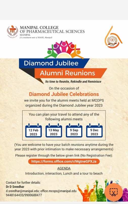 Year 2023 marks a major milestone for Manipal College of Pharmaceutical Sciences (MCOPS) as it celebrates its Diamond Jubilee. Year-long celebration flagged off on Thursday, 5 January 2023 at Dr TMA Pai Hall, Manipal. Diamond Jubilee Celebration was inaugurated by Mr HR Srinivasan, Chief Executive Officer, Navitas Life Sciences. The function was presided by Dr HS Ballal, Pro Chancellor, MAHE.