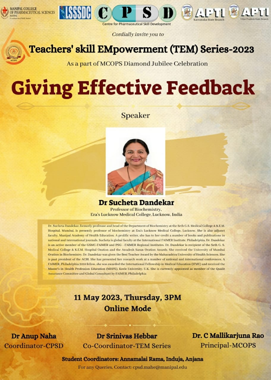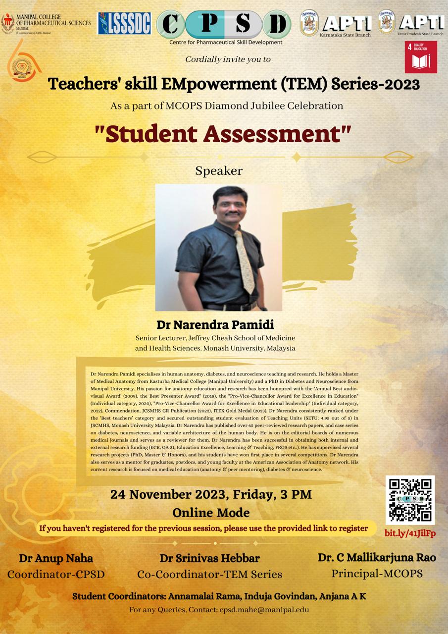 MCOPS Diamond Jubilee Commemorative Workshop on "Quality and Regulatory Compliance of Pharmaceuticals - An overview” - 24 March 2023