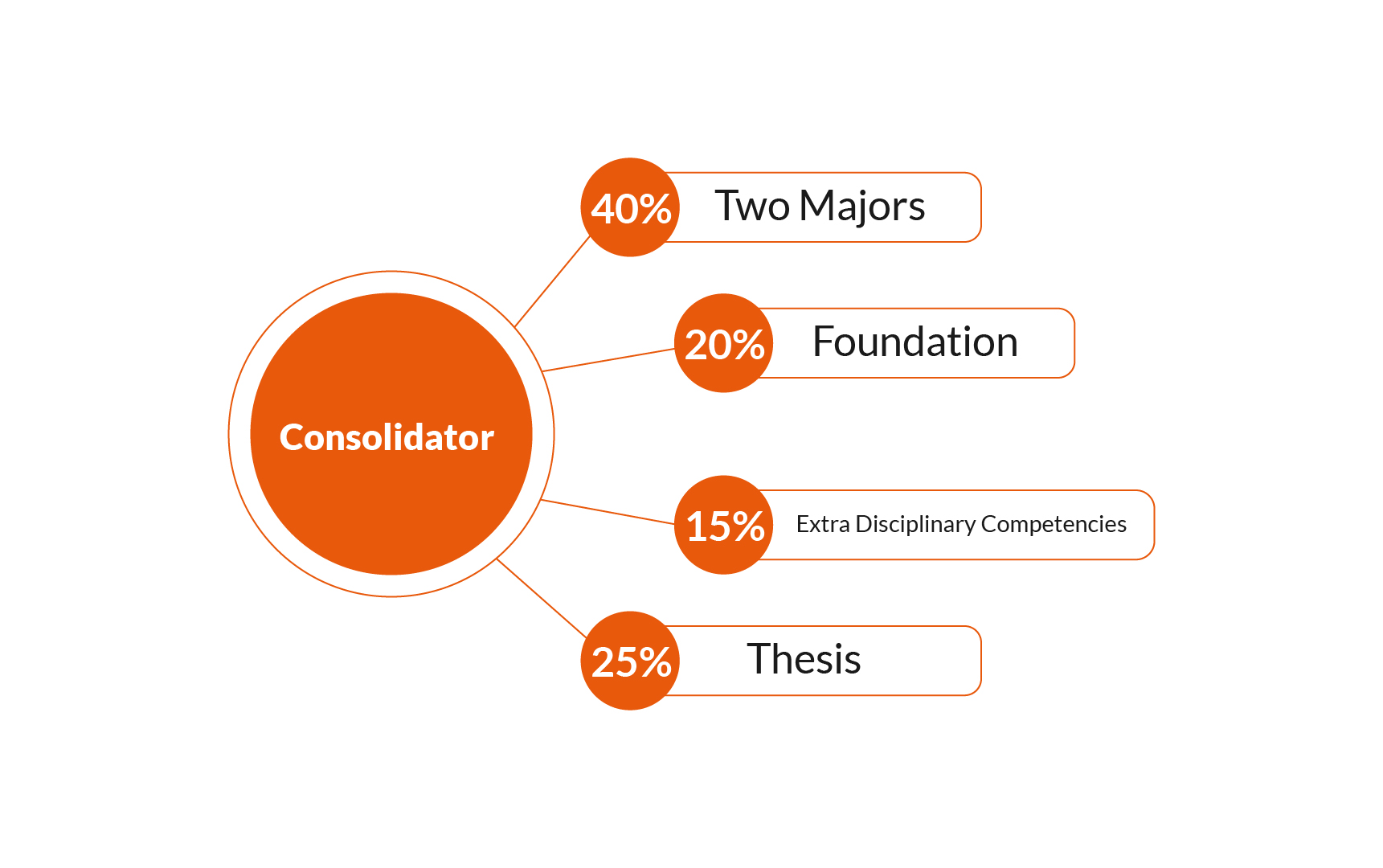 At the end of the first year, students decide between three learning pathways to study Majors, Double Majors, and Minors by opting for one of the following: Explorer (1 Major + 1 Minor), Innovator (1 Major + 2 Minors) and Consolidator (2 Majors).