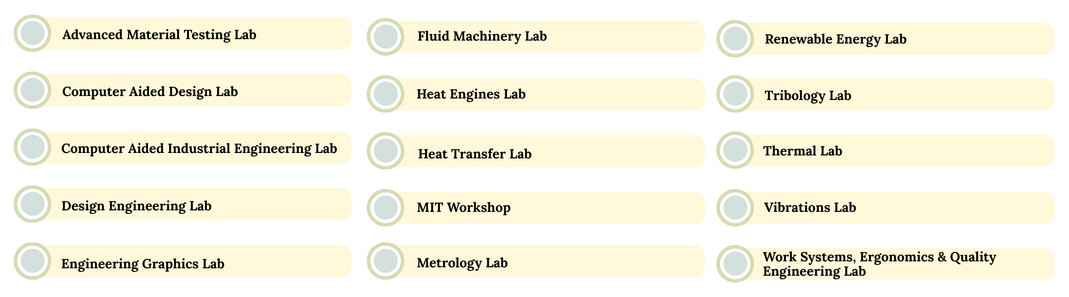 The department provides dedicated lab facilities for running lab-associated courses to undergraduate/postgraduate/research programs in the following areas of Materials, Design, Thermal, Manufacturing & Industrial Engineering. (Know More)