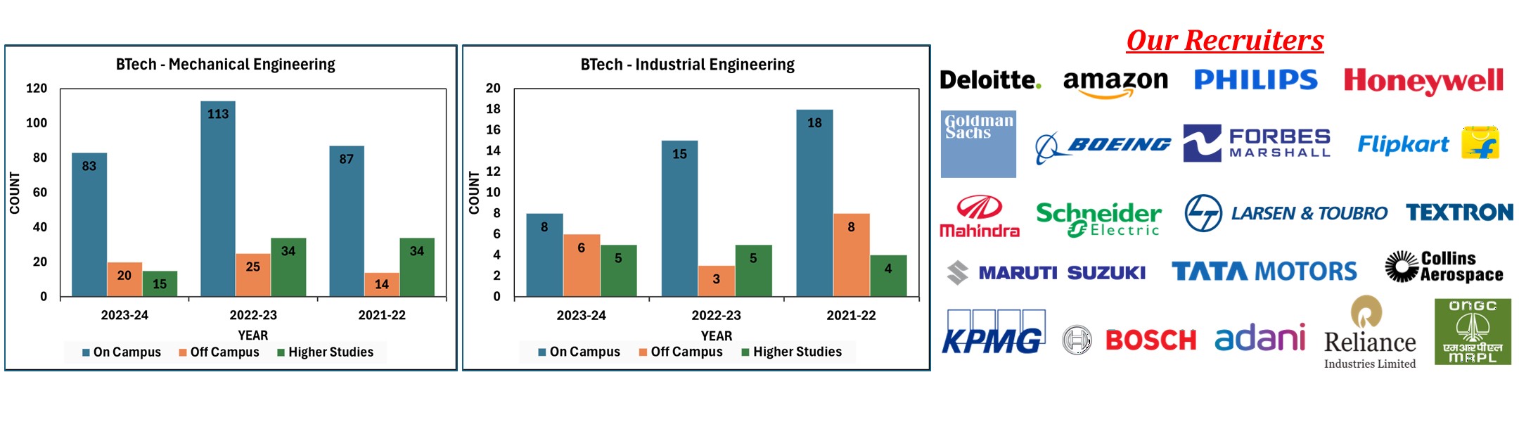 The department is well supported by the Institute placement team. The placement team is headed by Associate Director (Industrial Liaison, Placement & Practice School) and oversees the entire placement process in the institution with the help of department coordinators. Students are provided with opportunities for Internships, Placements, Pre-placement offers (PPO) in core companies and ITES. Our students from Mechanical and Industrial Engineering get recruited by a wide range of companies. (Know more)
