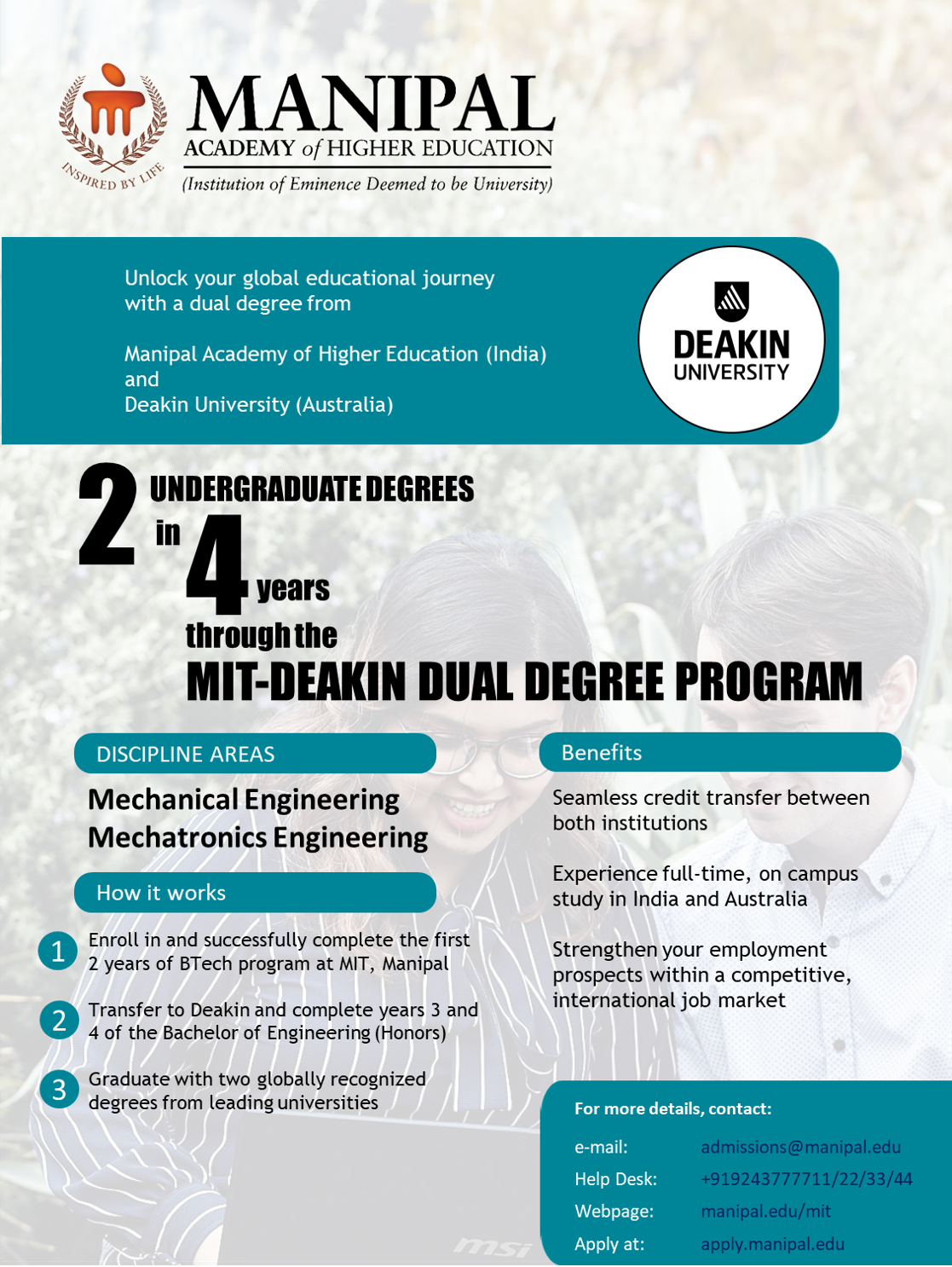 The department offers a dual degree program that allows students to complete two undergraduate degrees in four years. Students begin by enrolling in and successfully completing the first two years of the Bachelor of Technology (BTech) program in the Mechatronics stream at the Manipal Institute of Technology (MIT). Following this, they transfer to Deakin University to complete the remaining two years of the Bachelor of Engineering (Honours) program. Upon successful completion of the program, students graduate with two globally recognized degrees from two leading universities, MIT and Deakin University, enhancing their academic credentials and career prospects. (Brochure)