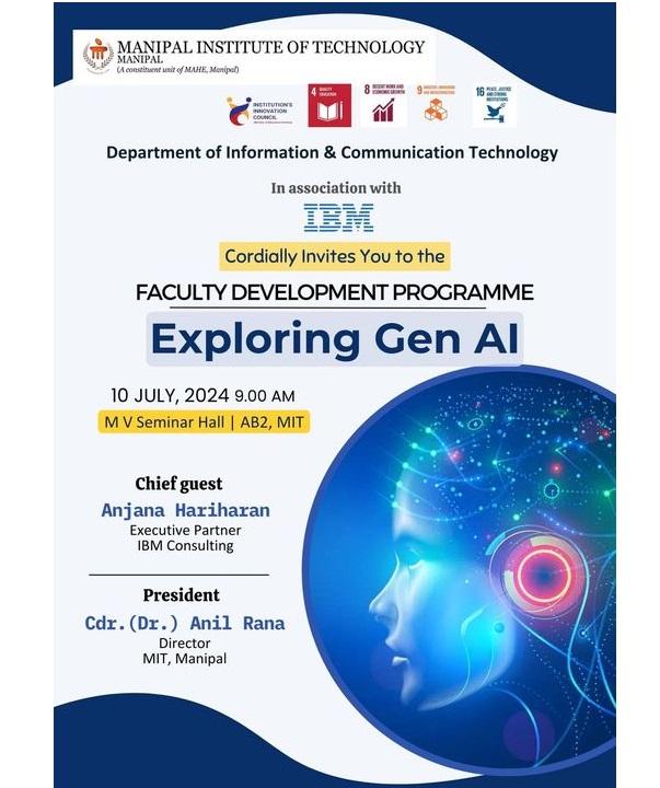 The Department of Information and Communication Technology is organizing a Faculty Development Program (FDP) on Exploring Generative AI to gain foundational knowledge, practical skills, and insights into future trends. Learn about core concepts, machine learning fundamentals, and training generative models, with hands-on sessions using popular AI frameworks. Explore advanced applications in text and image generation and discover recent advancements in the field. Understand the societal impact and security considerations of generative AI.