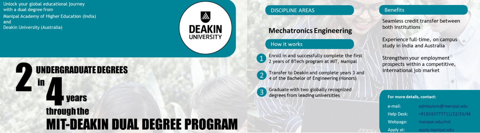 The department offers a dual degree program that allows students to complete two undergraduate degrees in four years. Students begin by enrolling in and successfully completing the first two years of the Bachelor of Technology (BTech) program in the Mechatronics stream at the Manipal Institute of Technology (MIT). Following this, they transfer to Deakin University to complete the remaining two years of the Bachelor of Engineering (Honours) program. Upon successful completion of the program, students graduate with two globally recognized degrees from two leading universities, MIT and Deakin University, enhancing their academic credentials and career prospects. (Brochure)