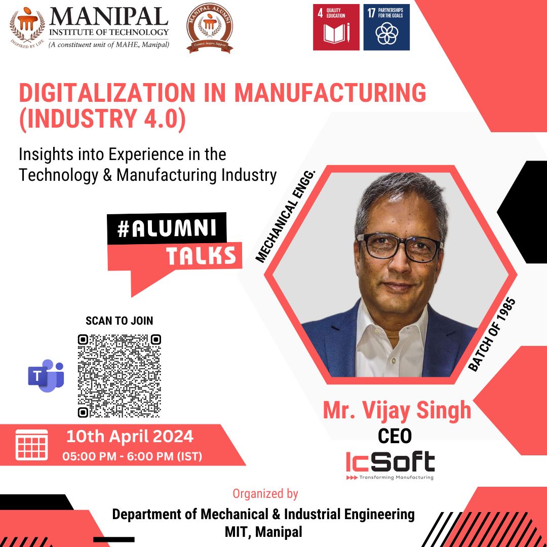 - Alumni Talk by Mr Vijay Singh, CEO, IcSoft, India - Digitalization in Manufacturing (Industry 4.0), 10 April 2024, 5-6 PM. (Know more)